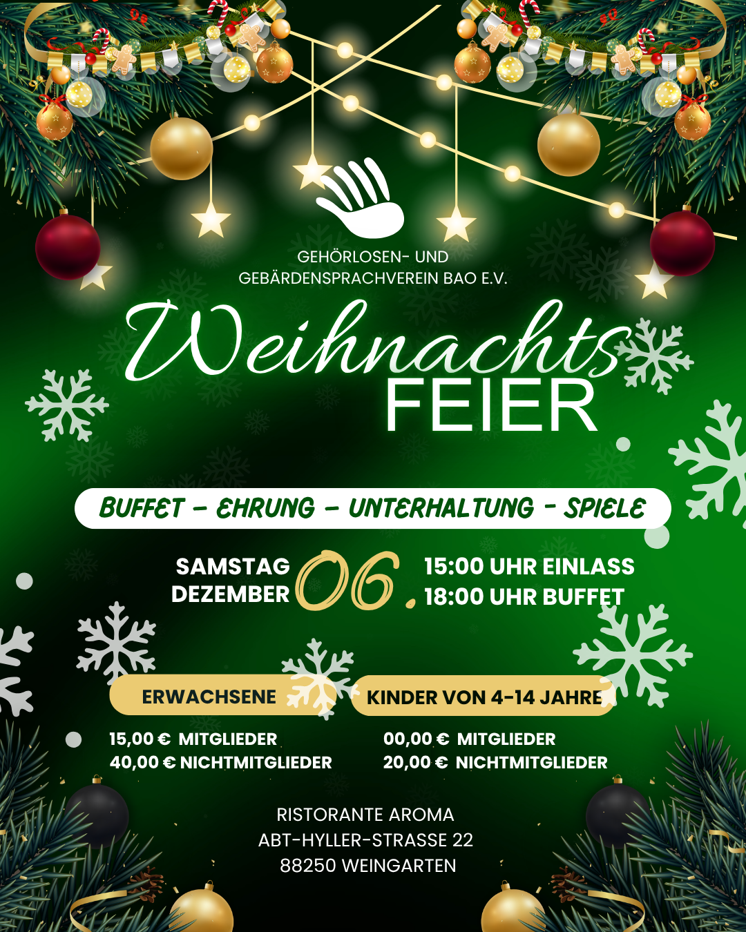 16.November @ 13:00 - 17:00 Weihnachtsfeier Ristorante Aroma Abt-Hyller-Straße 22, Weingarten, Germany